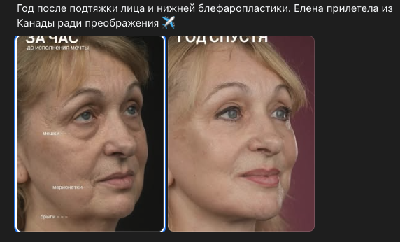Старение — это не только птоз. Это ещё качество кожи, истончение мягких тканей, перераспределение жира, изменения в зоне нижнего века, виска, верхней губы, подбородка. На фото «после» лицо аккуратнее, но уже сильный возрастной дефицит объёма и просевшая костная опора, одна подтяжка не делает магию «минус 20 лет». Такая же возрастная, ну, чуть свежее.